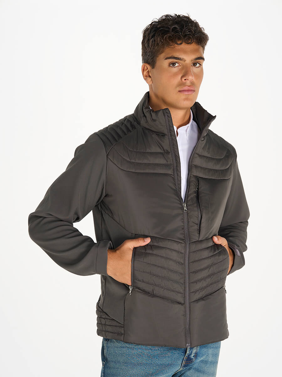 Giacca con cerniera centrale e protezione per il mento in tinta; Interno in tessuto micropil; Parte frontale, spalle e fondo posteriore imbottiti; Pannelli laterali e posteriori in softshell tono su tono; Due tasche lat…